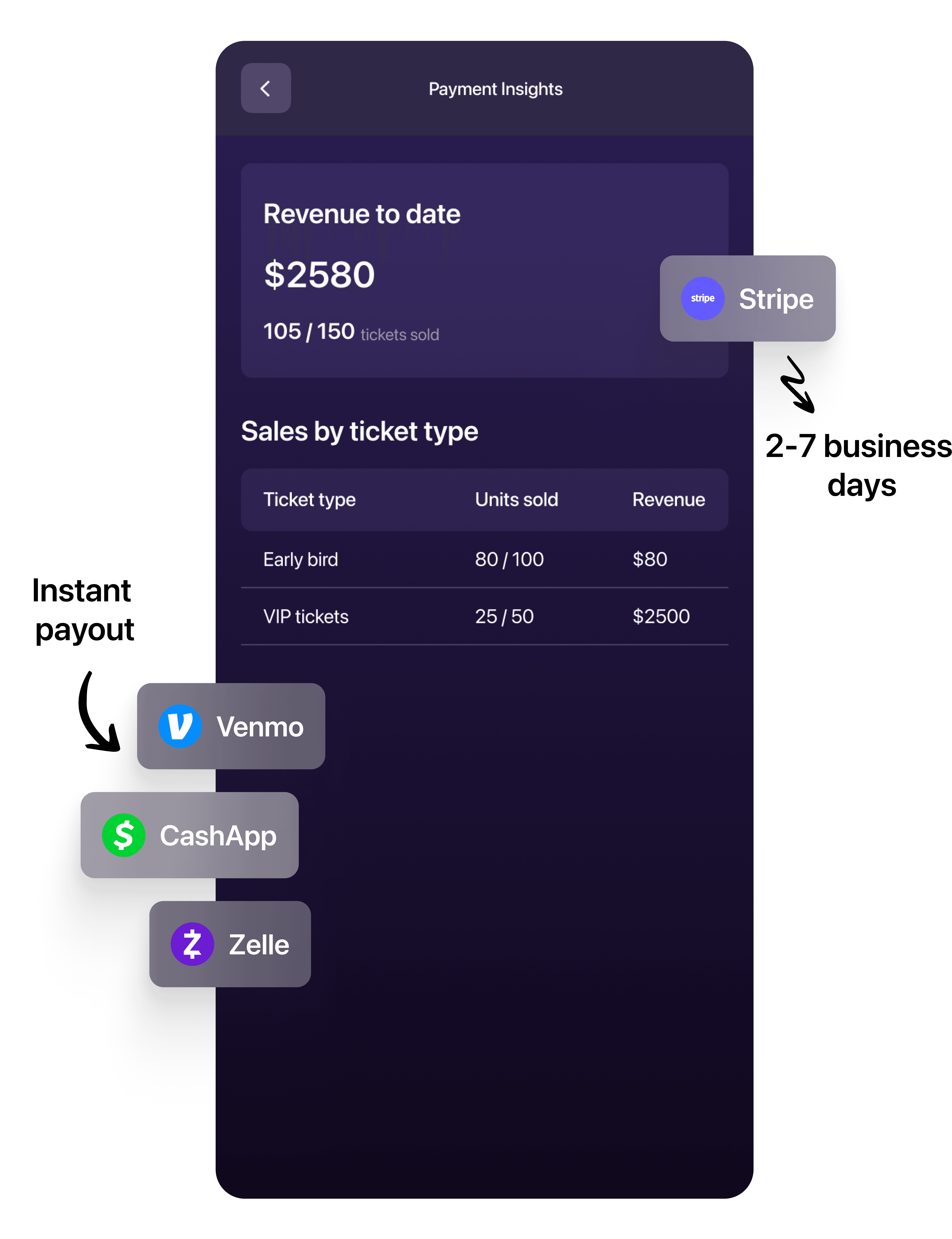 Venmo, Cash App & Zelle payments hit your account instantly. Card payments arrive in 2–7 business days.