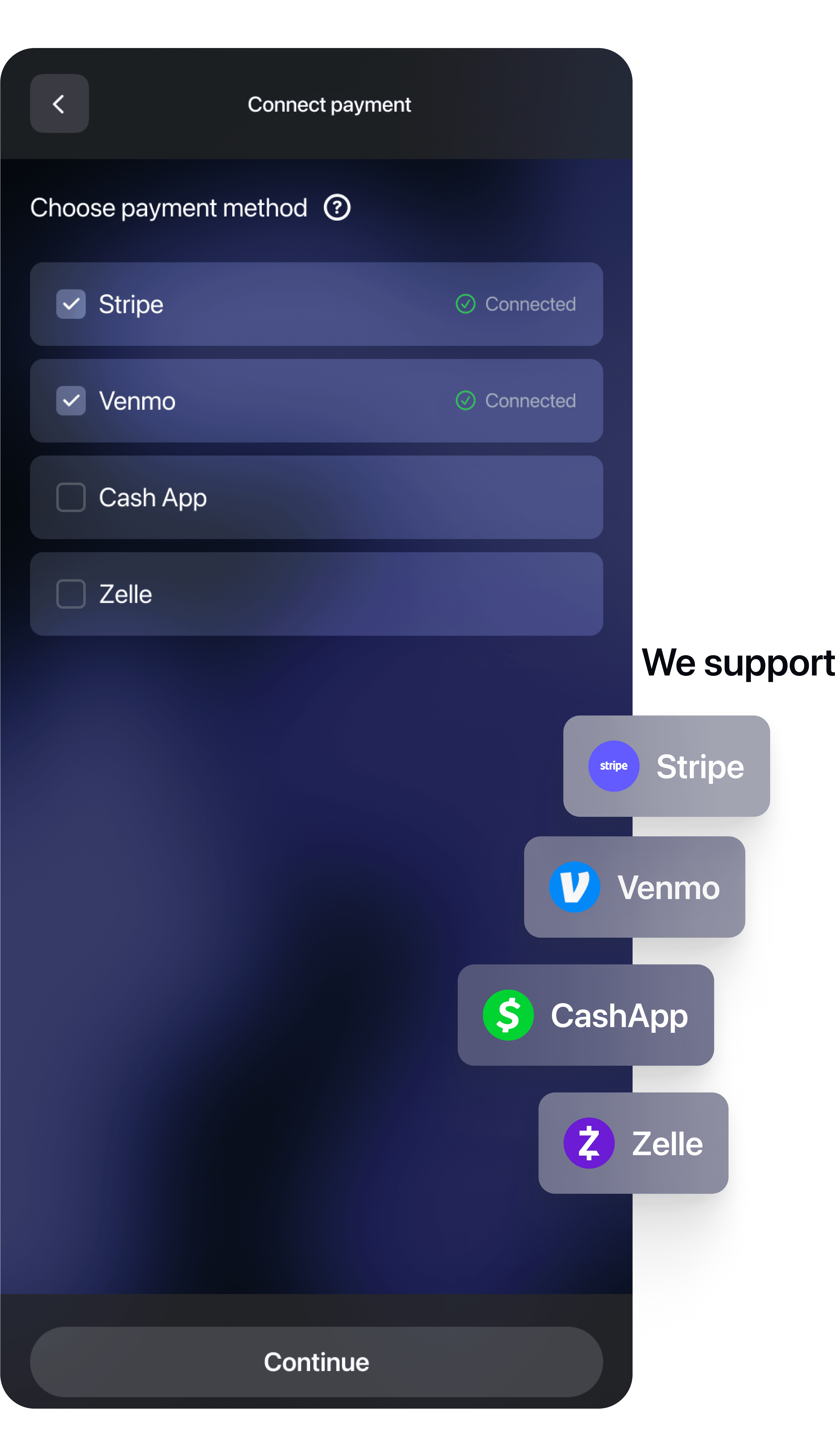 Link Stripe, Venmo, Cash App, or Zelle. Enable one or all — your guests pay the way they already pay friends.